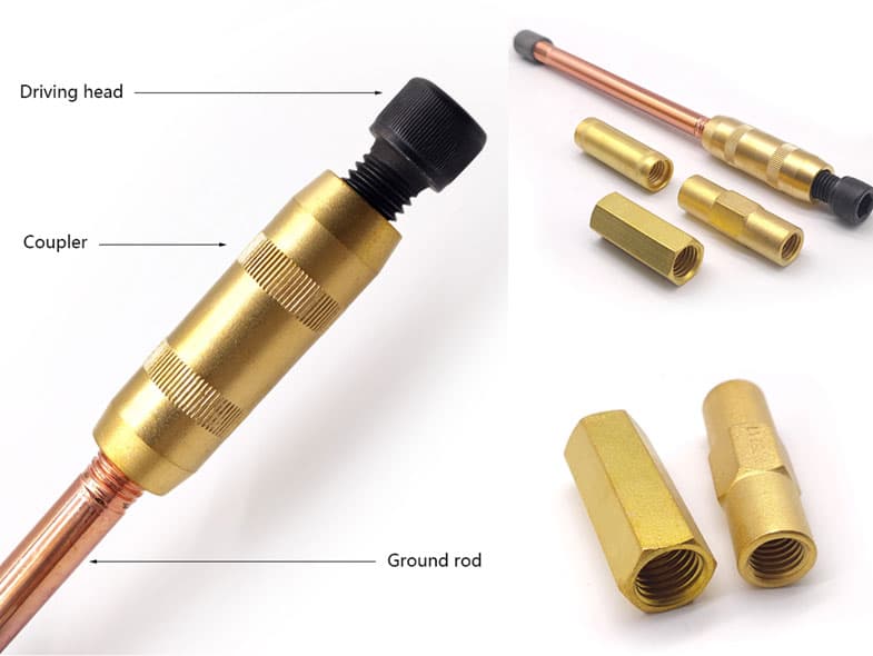 This coupling joins lengths of threaded copper bond earth rods together. They facilitate deep driving and ensure continual contact between the rods during and after driving. The coupling also protects the rods threads while using the driving stud. The coupling has lead for ease of assembly and a hex on the outside for grip and keeping the coupling tight when driving into the ground.