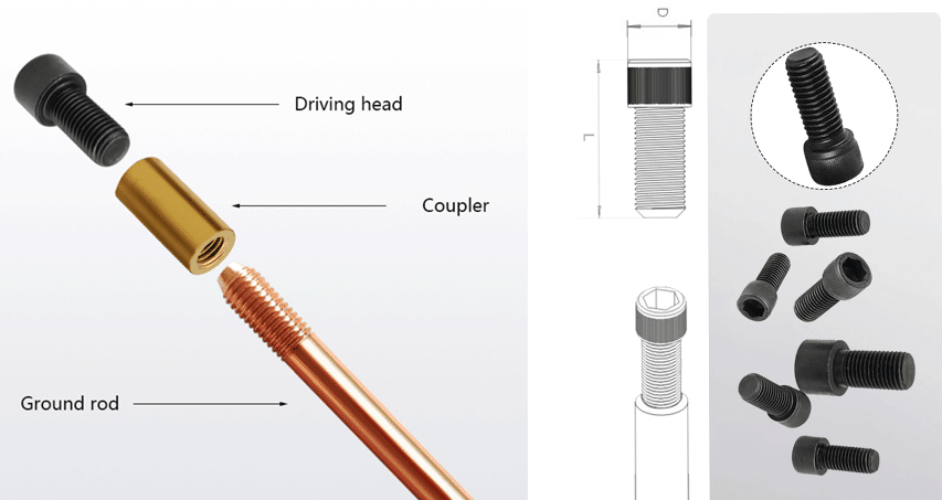Combined copper-plated ground rods are equipped with a coaxial connector, a driving head and a drill bit. According to different geological and usage requirements, the length of the copper-plated grounding rod can be increased arbitrarily by using the coaxial connector. The top of the rod adopts a driving head (or hammer head) for deep drilling, and the end adopts a special drill bit to facilitate deep drilling of the rod.