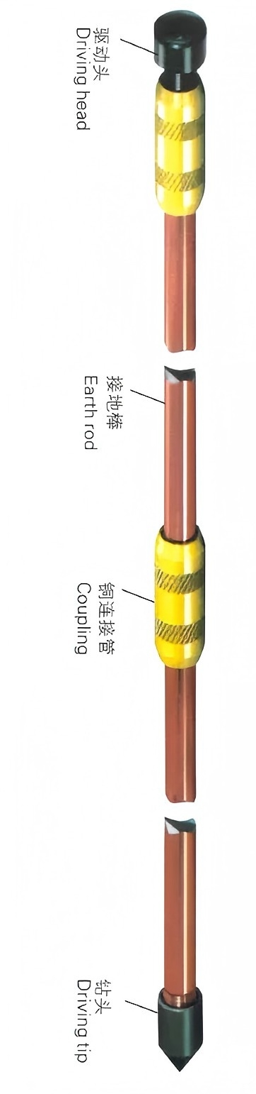 Ground rod structure The main body of the grounding rod is composed of an integrally formed steel core, and the outer layer is fully combined with the steel core by an ultrasonic process, and then an integral part, such as a drving tip, a coupling and a driving head form a whole. Grounding rod installation and use method The grounding rod is very flexible during construction. Different construction methods can be used according to the specific conditions of the site. For example, it can be directly driven into the soil by heavy hammer and electric shovel. Under complicated soil conditions, the grounding rod can not be driven,drilling holes before installing the ground rod. When using heavy hammer construction under uniform soil conditions, if only a single penetration is required, the driving tip(impact-resistant bolt) should be installed at the tip of the ground rod to avoid damage to the copper layer when the ground rod is deepened. In the case of deeper grounding, a number of grounding rods can be connected to the coupling to the required length, which allows the grounding rod to achieve a good electrical connection When it is difficult to drill deep or no access to the soil, it is necessary to drill through the rock using drilling tools such as electric, pneumatic and oil-driven machines. After drilling, the following two methods can be used to install the ground rod: 1.Connect the ground rod to the required length with a connector. After drilling to a predetermined depth, backfill the earth improving enhancing compounds and add water to the hole until the entire hole is filled with earth improving enhancing compounds. 2.Connect the grounding rod with the connector to the required length, drill into the predetermined depth, and then mix the earth improving enhancing compounds with water and pour it into the hole to fully wrap the grounding rod.
