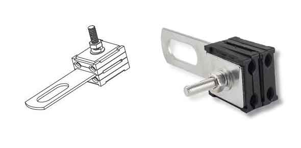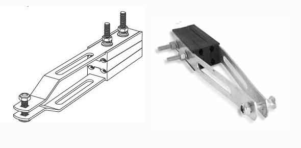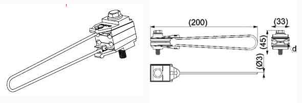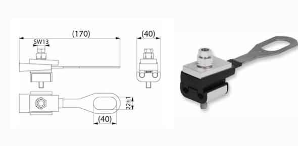 Tension clamp for the anchoring of 2-core 2x(16-35) mm² overhead cables to poles or walls by standard hooks. Tension clamp is equipped with a spring to make the installation easier.